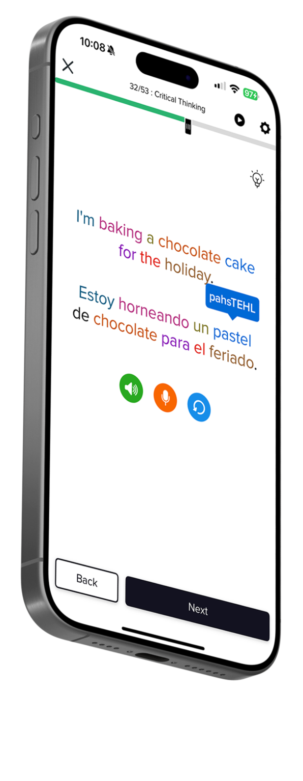 Intuitive Language Construction™ builds the 6 critical skills necessary for true language learning. Vocabulary, grammar, pronunciation, culture, comprehension and retention.